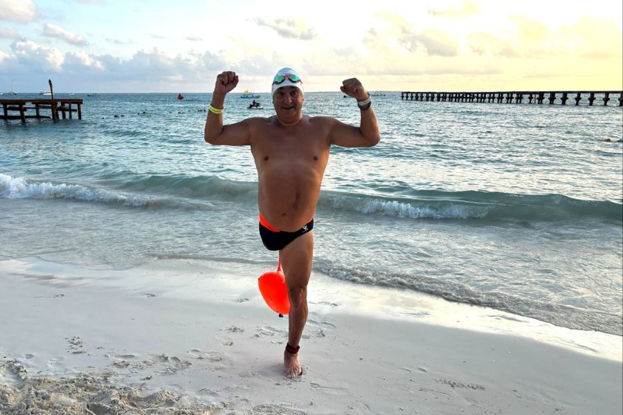 El argentino de 57 años de edad realizó por sexta ocasión el cruce Cancún-Isla Mujeres nadando con una sola pierna.