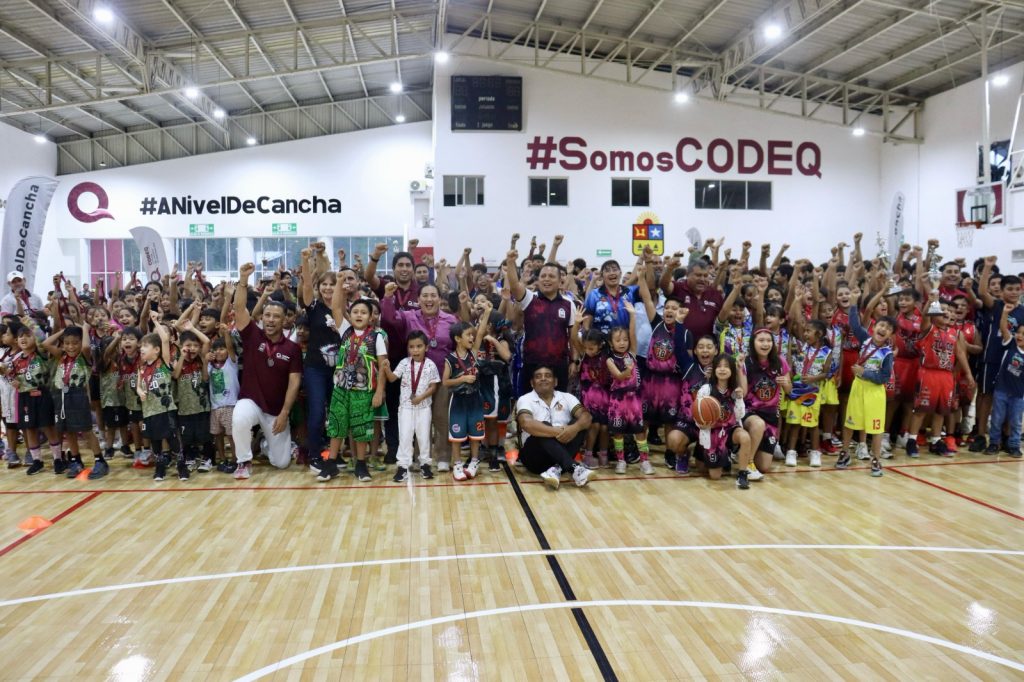 Chetumal.- En una colorida ceremonia, ambientada por entusiastas niñas, niños y jóvenes en el renovado Gimnasio “Nohoch Suku’n”, se llevó a cabo la premiación de la Liga Formativa de Básquetbol de la CODEQ, un espacio en el que compiten alrededor de 350 jugadores y que estuvo encabezado por Elda Xix Euán, secretaria de Educación en Quintana Roo y Jacobo Arzate Hop, presidente de la Comisión del Deporte de Quintana Roo (CODEQ).