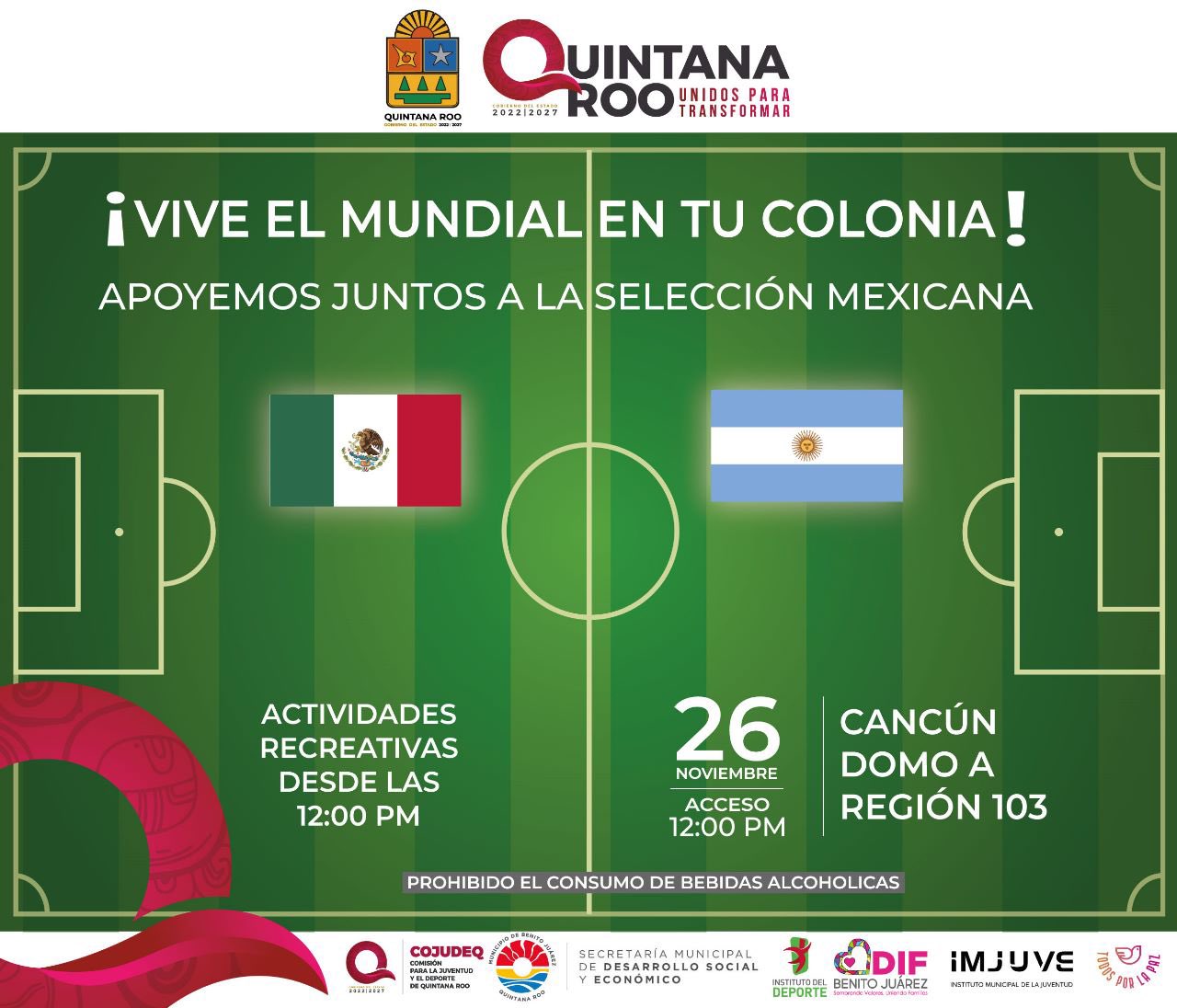 Cancún.- Como parte de ¡Vive el Mundial en tu colonia! el próximo sábado 26 de noviembre se transmitirá en pantalla gigante el encuentro de México y Argentina en Chetumal y Cancún de manera simultánea, informó el presidente de la Comisión para la Juventud y el Deporte de Quintana Roo (COJUDEQ) Eric Arcila Arjona.