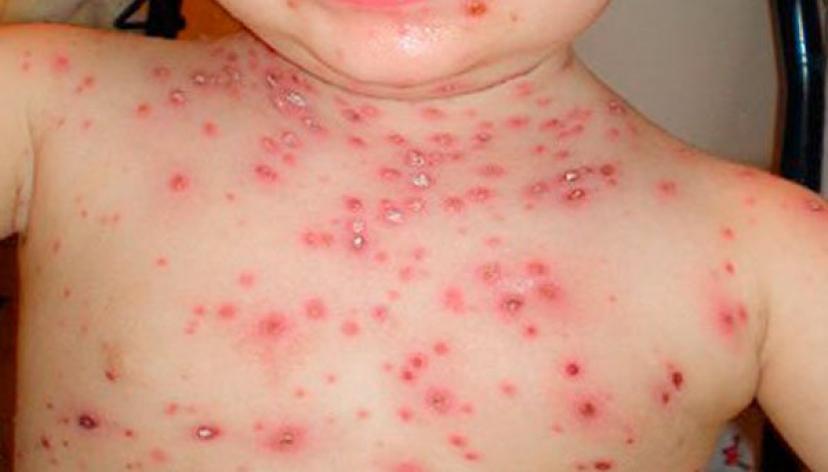 La erupción generalmente comienza en el primer o tercer día del comienzo de la fiebre. Las lesiones pueden ser planas o ligeramente elevadas, llenas de líquido transparente o amarillento, para después formar costras, secarse y caerse.