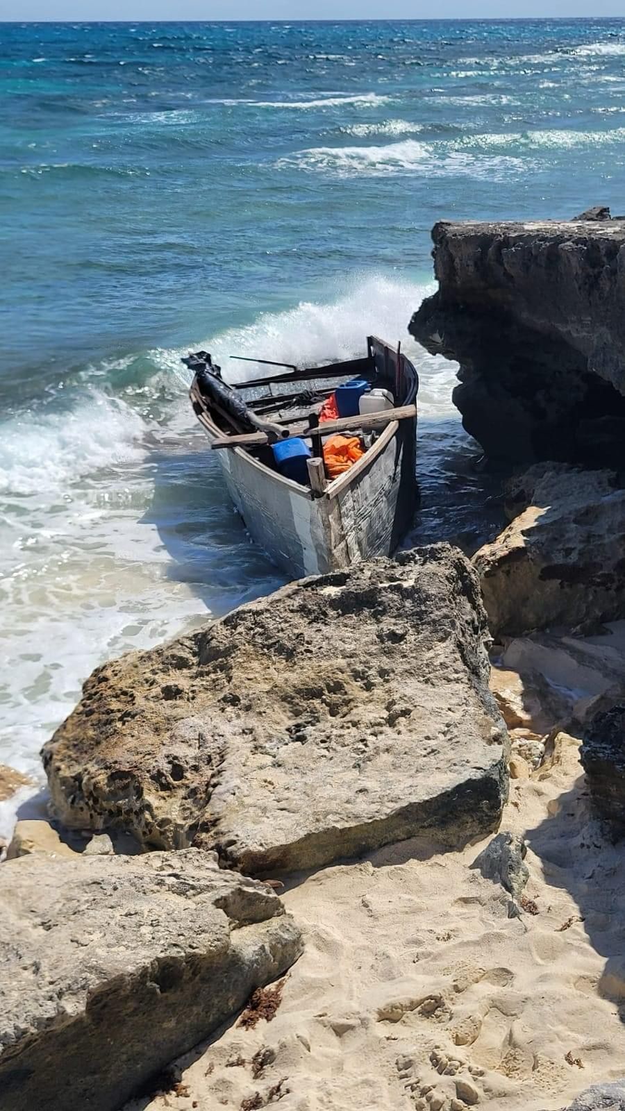 Habitantes de la zona se acercaron a la embarcación y se percataron que en su interior había ropa, así como deshechos de comida, garrafones y botellas de agua, entre otros artículos con los que los cubanos subsistieron durante su travesía.
