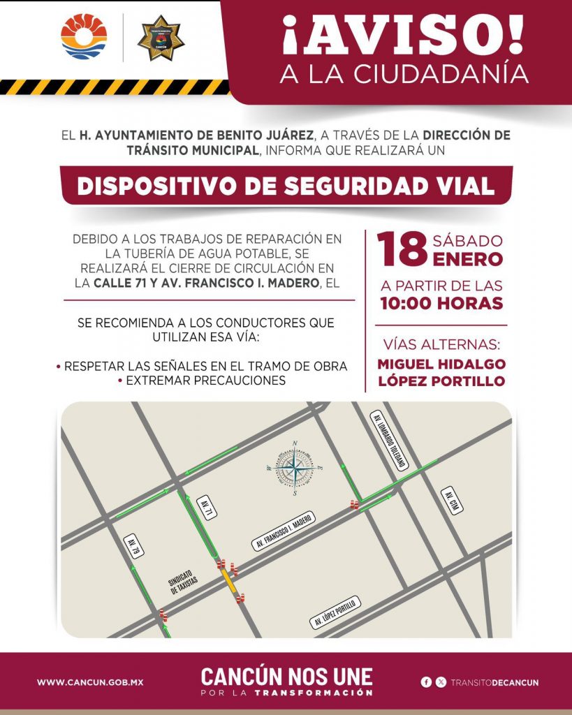 Cancún, Q. R., a 17 de enero de 2025.- El Ayuntamiento de Benito Juárez, a través de la Dirección de Tránsito Municipal, informó que debido a la reparación de una tubería de agua potable sobre la avenida Francisco I. Madero, se llevará a cabo un dispositivo de seguridad vial.