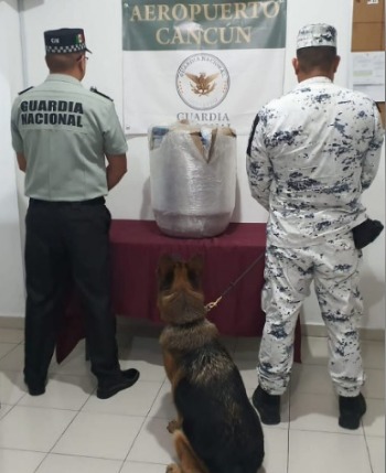 CANCÚN.- Aproximadamente 22 kilos de droga fueron asegurados en el Aeropuerto Internacional de Cancún por parte de elementos de la Guardia Nacional, acompañados de un agente canino realizaron la detección de la droga presuntamente marihuana que se encontraba dentro de un paquete en forma cilíndrica en una empresa de envíos en la terminal aérea, durante el fin de semana.