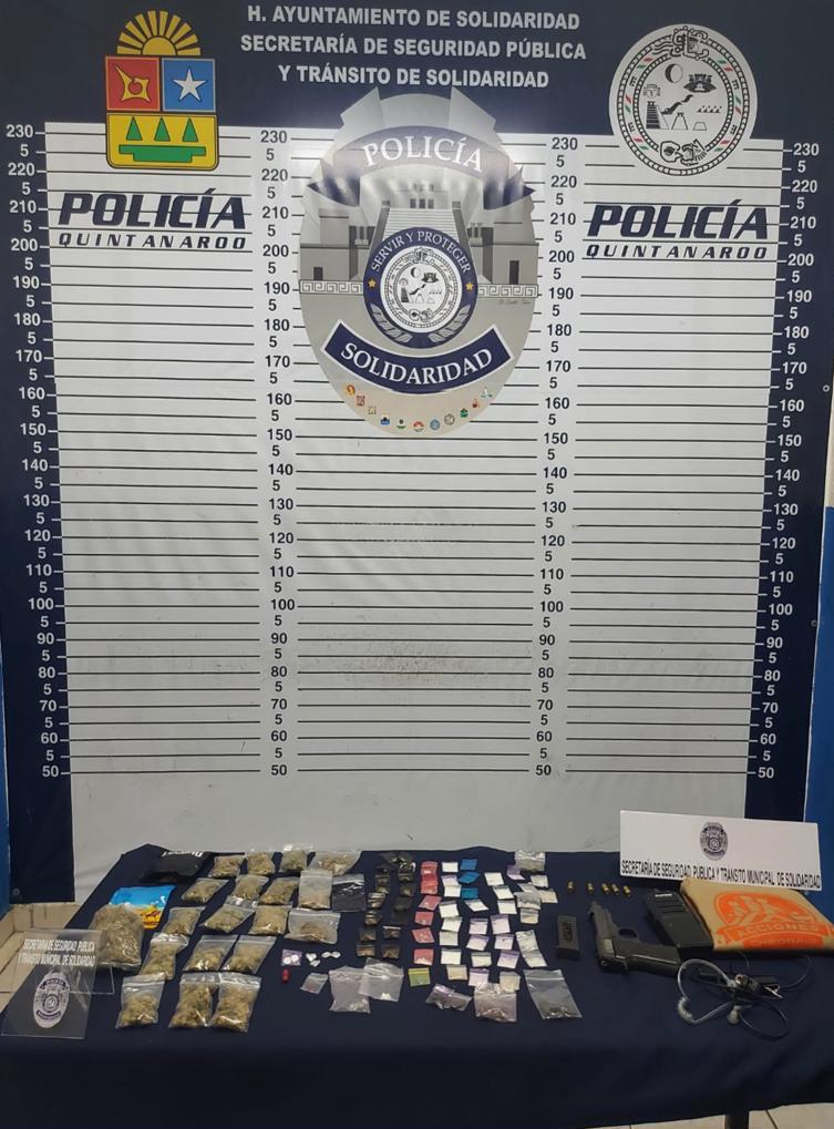 Policías de Solidaridad aseguraron 86 bolsitas con narcóticos y un arma de fuego durante un operativo de vigilancia en calles de la colonia centro en Playa del Carmen.