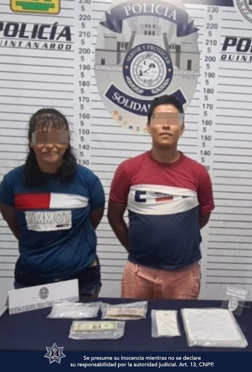 Policías de la Secretaría de Seguridad Pública y Tránsito Municipal de Solidaridad aseguraron a un hombre y una mujer en posesión de 161 bolsitas con posible crack y más de 17 mil pesos en efectivo en la colonia Luis Donaldo Colosio.