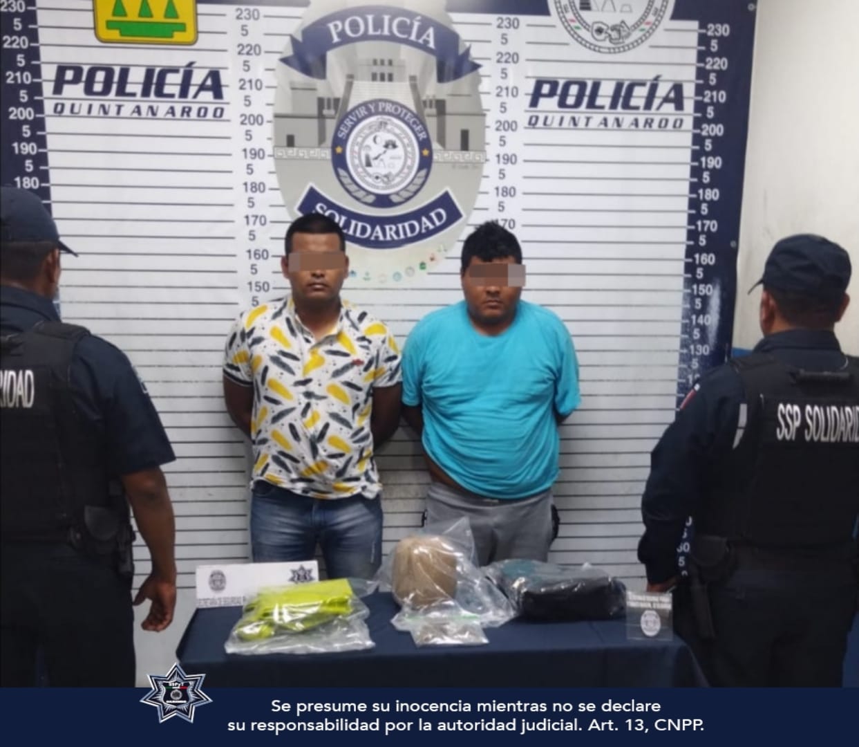 Playa del Carmen.- La respuesta inmediata de los policías de la Secretaría de Seguridad Pública y Tránsito Municipal de Solidaridad ante una denuncia anónima, así como un operativo de reacción inmediata a un autobús del servicio público, logró el aseguramiento de dos sujetos que tenían narcóticos en su posesión.