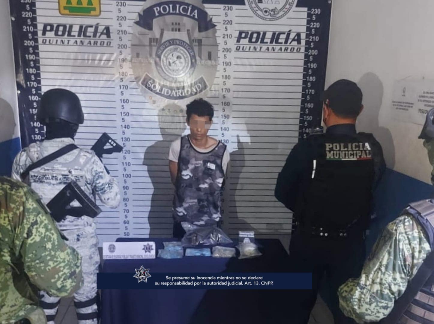 Un sujeto en posesión de 87 bolsitas con posibles narcóticos fue asegurado en el fraccionamiento Villas del Sol durante un operativo de vigilancia y prevención implementado por policías de la Secretaría de Seguridad Pública y Tránsito Municipal de Solidaridad en coordinación con la MARINA, SEDENA y Guardia Nacional.