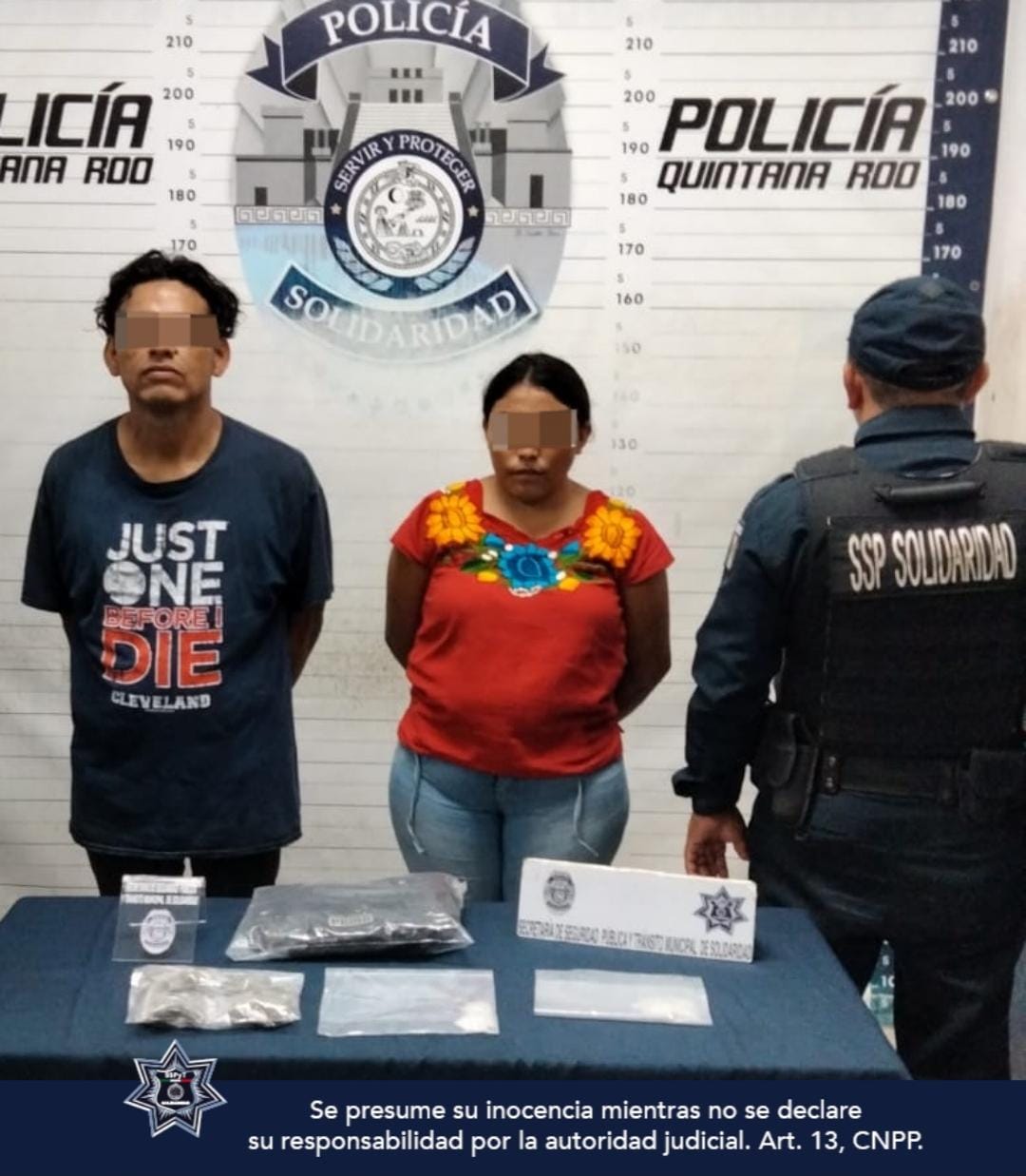 PLAYA DEL CARMEN.- Una mujer y un hombre fueron detenidos por elementos de la Policía Municipal de Solidaridad en posesión de posibles narcóticos como marihuana y metanfetamina.