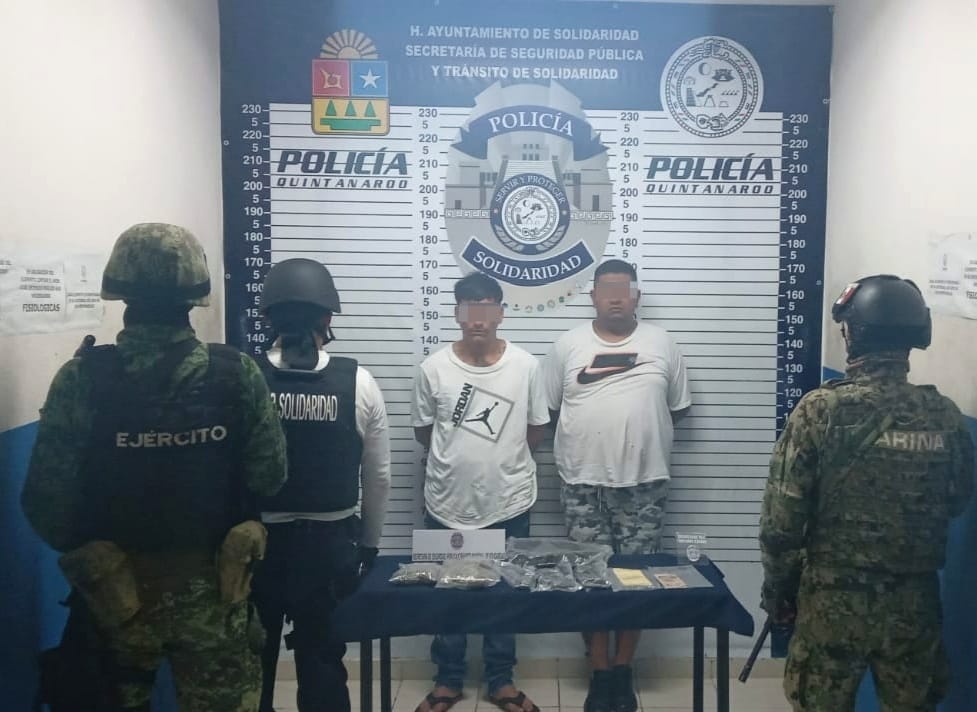 Solidaridad.- En respuesta a una solicitud de auxilio, policías de la Secretaría Seguridad Pública y Tránsito Municipal de Solidaridad, elementos de la MARINA y la SEDENA, aseguraron a dos personas en posesión de posibles narcóticos y por la posible comisión del delito de extorsión en la colonia Gonzalo Guerrero.