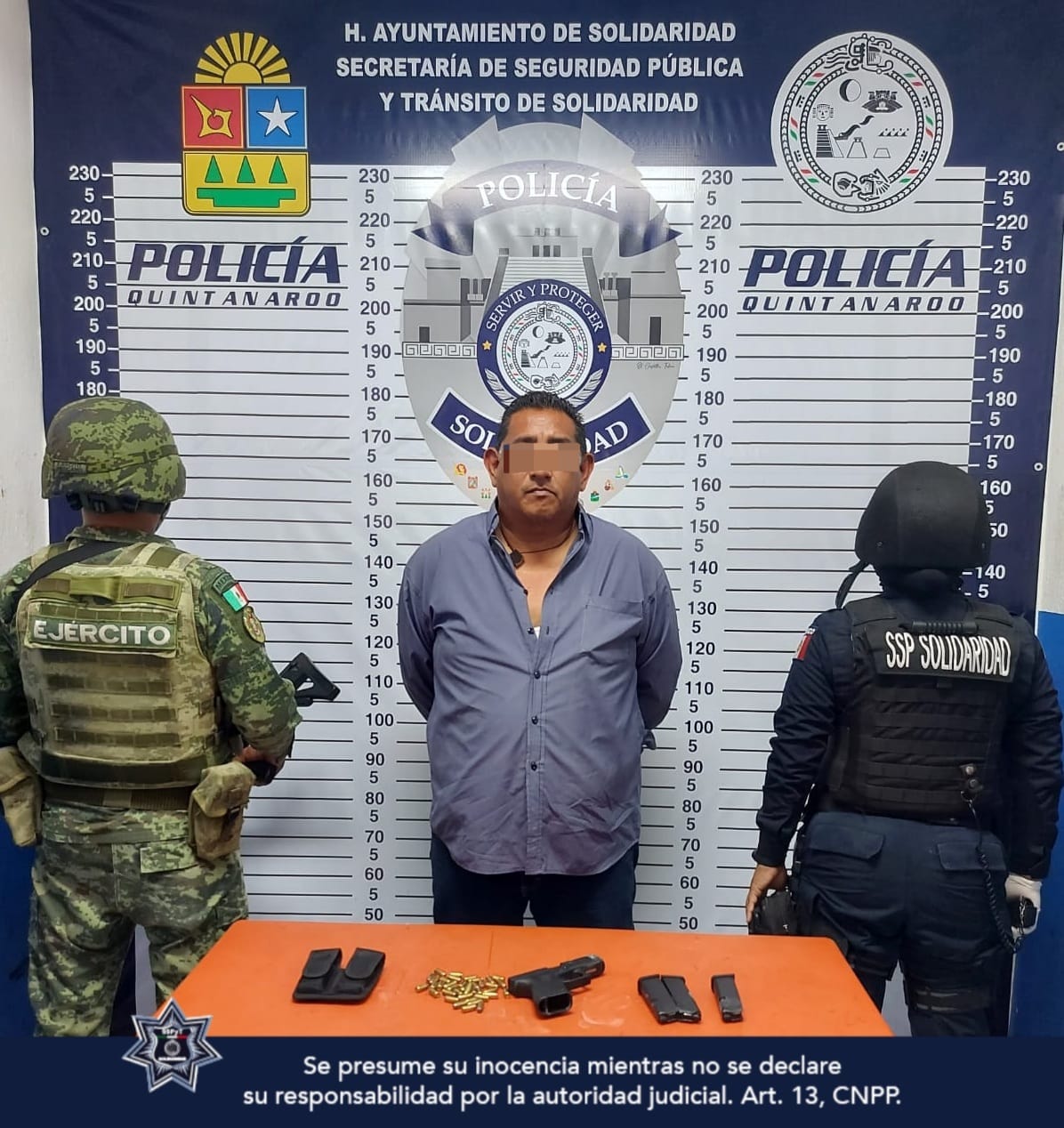 PLAYA DEL CARMEN.- Policías de la Secretaría de Seguridad Pública y Tránsito Municipal de Solidaridad y elementos de la Secretaría de la Defensa Nacional, aseguraron a un sujeto en portación de un arma de fuego y 38 cartuchos útiles.