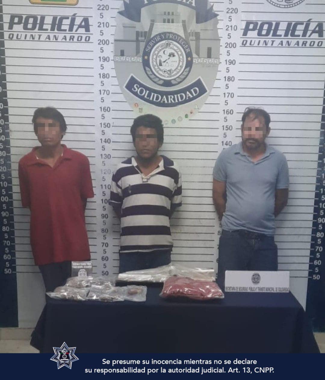 SOLIDARIDAD.- Policías de la Secretaría de Seguridad Pública y Tránsito Municipal de Solidaridad aseguraron a tres sujetos por la posible comisión de un delito contra la salud en posesión de posibles narcóticos y un arma de fuego hechiza.