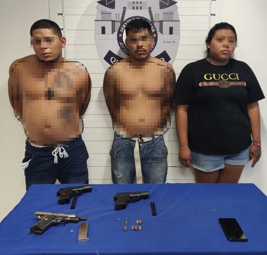 Cancún.- Oficiales de la Policía Quintana Roo Benito Juárez, lograron el aseguramiento de tres masculinos y una fémina por los delitos de portación de arma de fuego, encubrimiento y tentativa de homicidio, en la Supermanzana 99