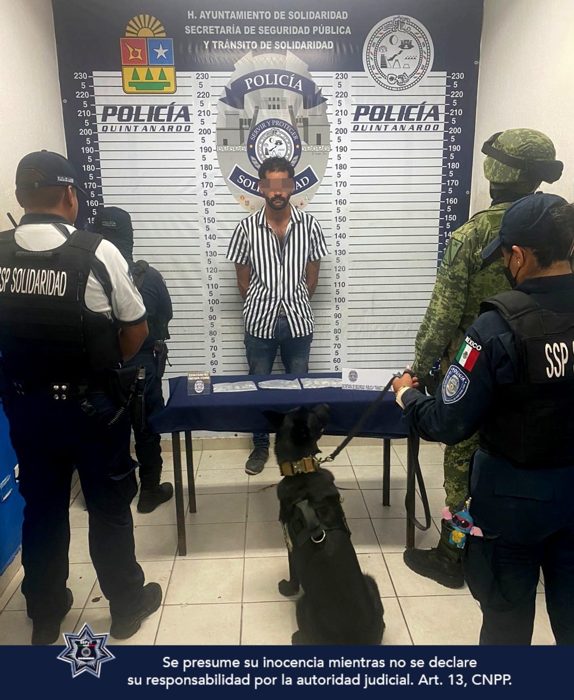 Luis “N” de 30 años de edad, originario de Aguascalientes, fue asegurado la madrugada de hoy 6 de agosto, cuando los oficiales que realizaban vigilancia a pie sobre la calle 4 con Quinta avenida y la playa, pasaron junto a él y el oficial canino de la Unidad K9 realizó un marcaje de alerta señalándolo.