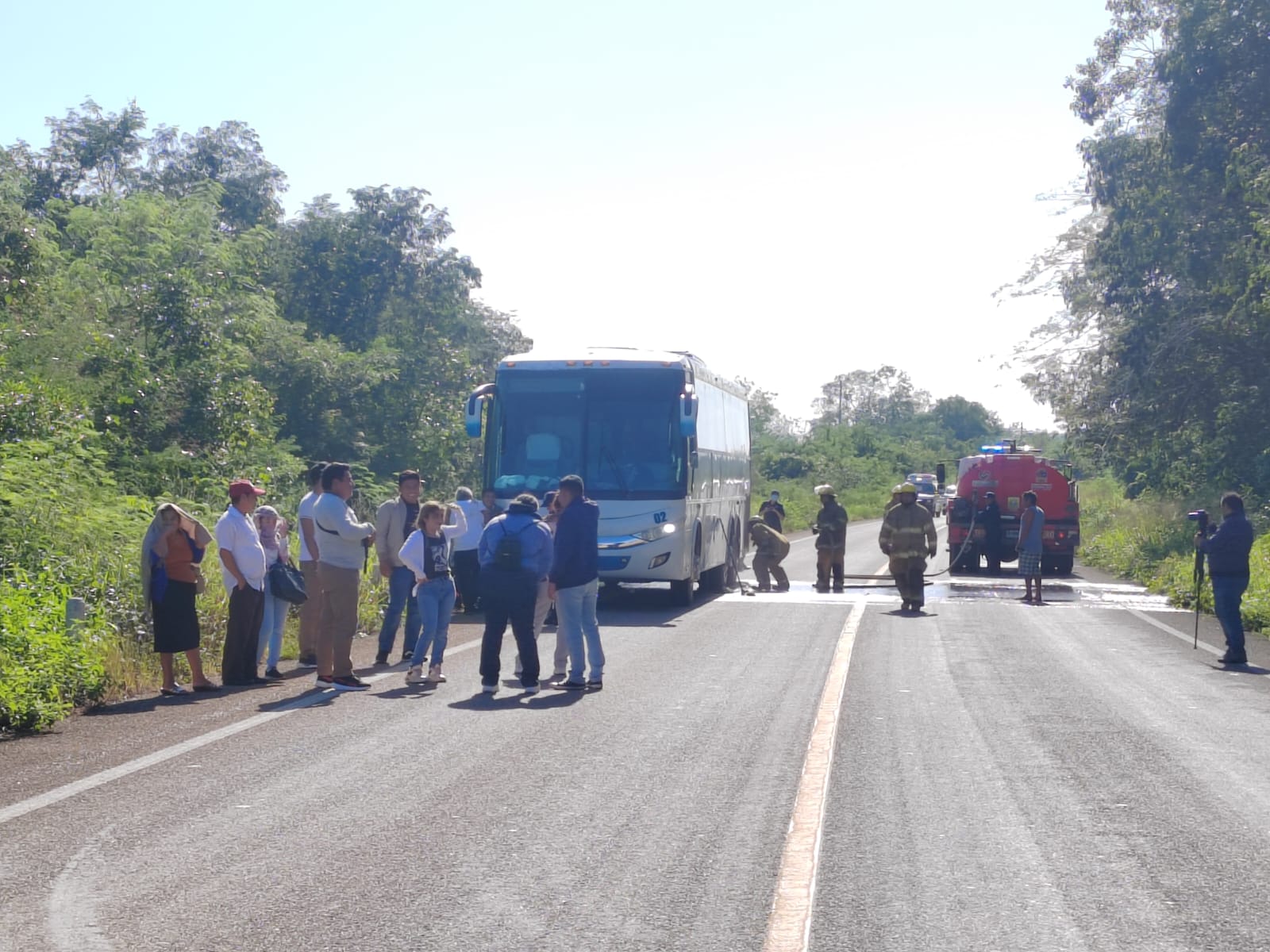 JOSÉ MARÍA MORELOS.- Esta mañana una de las llantas traseras de un autobús que transportaba a un grupo de personas a un evento religioso comenzó a incendiarse, lo que generó la movilización de los cuerpos de emergencia, esto en el tramo carretero José María Morelos-Polyuc.