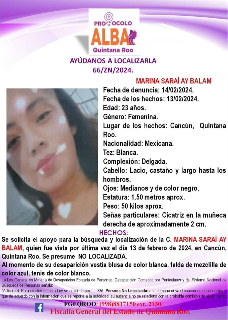 Rosenda Caamal, suegra de Ay Balam, precisó que fue vista la última vez en la ciudad de Cancún y vestía blusa de color blanca, falda de mezclilla de color azul y tenis de color blanco.