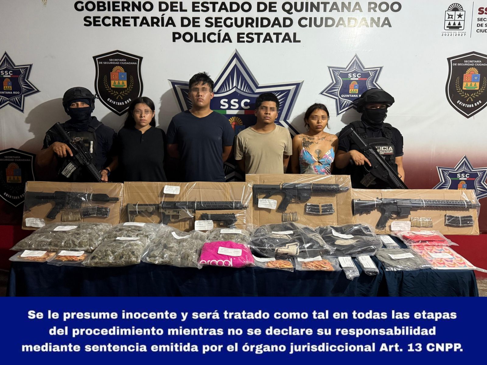 Cancún.- Se realiza la detención de Luis Ángel “N”, Bruno Rafael “N”, Jeimmi Carolina “N” y Sarai “N”, presuntas implicadas en delitos Contra la Salud y por el delito de Violación a la Ley Federal de Armas de Fuego y Explosivos