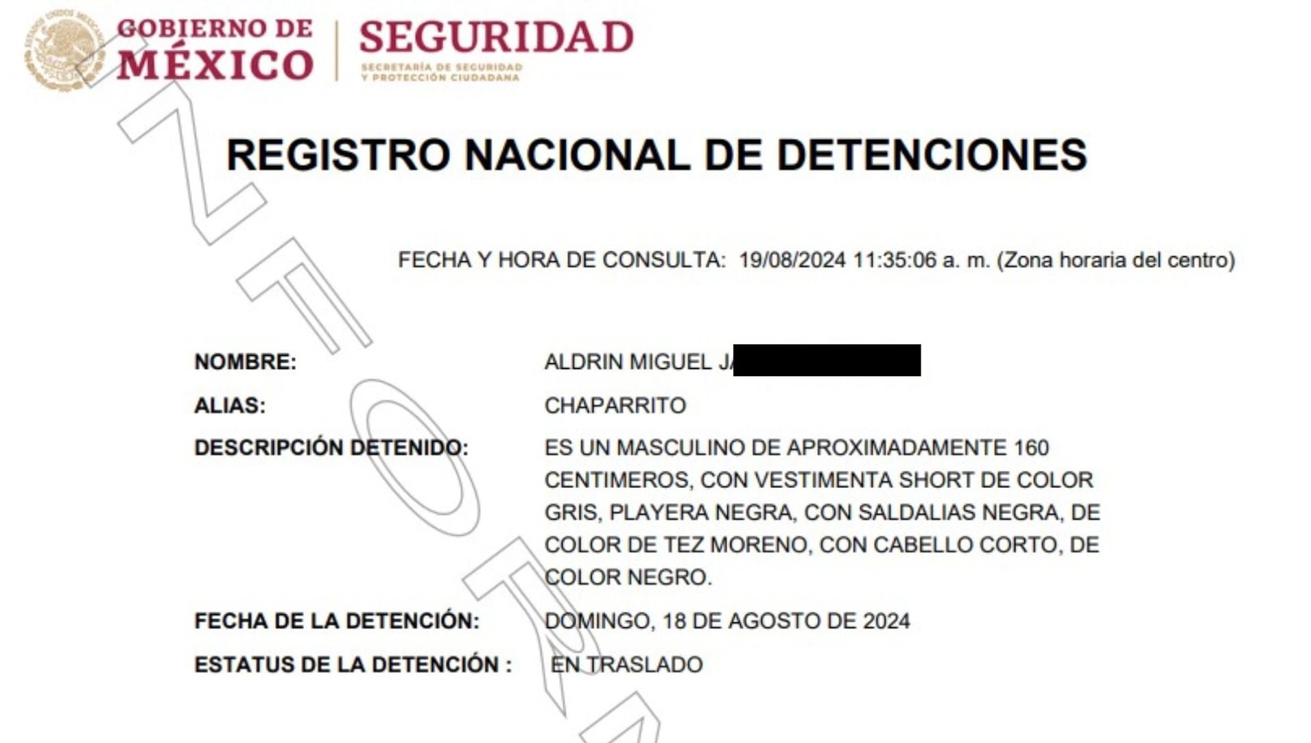 El arresto del “Chaparrito” no fue informado previamente a la Secretaría de Seguridad Pública, y en la ficha oficial del Registro Nacional de Detenciones (RND) solo se detallan características físicas del detenido, sin especificar la ubicación exacta de la aprehensión ni la autoridad que la llevó a cabo.