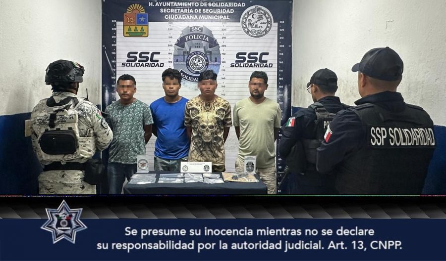 PLAYA DEL CARMEN.- Detienen policías de Solidaridad a cuatro sujetos con droga y arma de fuego en la colonia Nuevo Noh Bec de Playa del Carmen.