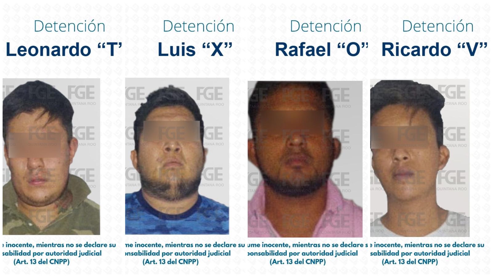 Solidaridad.- La Fiscalía General del Estado de Quintana Roo informa que, agentes de la policía de investigación en colaboración con –el Grupo de Coordinación para la Construcción de Paz y Seguridad en Quintana Roo- conformado por elementos de la Secretaría de la Defensa Nacional, la Secretaría de Marina, la Guardia Nacional, la Policía Quintana Roo-, con la Comisión Nacional Antisecuestros de la Secretaría de Seguridad y Protección Ciudadana del Gobierno Federal y la policía municipal de Tulum, lograron la captura de 4 sujetos identificados como Luis “X”, Ricardo “V”, Leonardo “T” y Rafael “O” por su probable participación en la comisión de los delitos de homicidio -en agravio de 6 víctimas- y narcomenudeo.