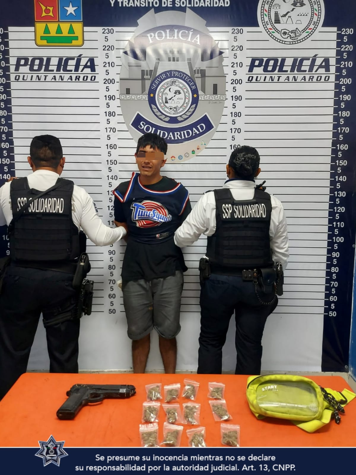 PLAYA DEL CARMEN.- En posesión de una réplica de arma de fuego y 12 bolsas de posible marihuana, fue asegurado un sujeto por policías de la Secretaría de Seguridad Pública y Tránsito Municipal de Solidaridad en la colonia Colosio.