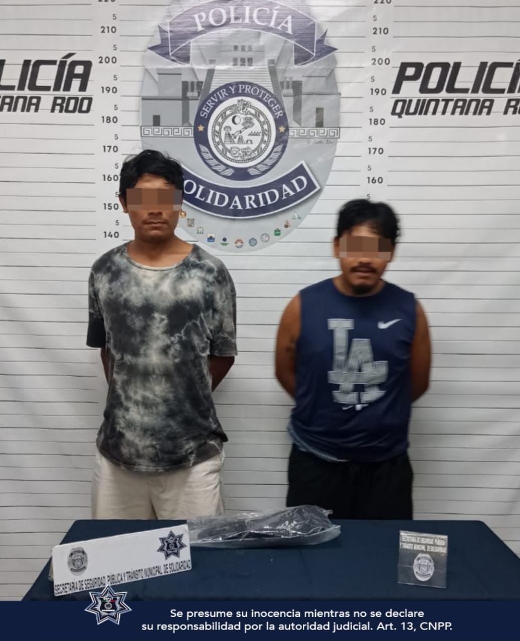 Playa del Carmen, Solidaridad2. – Dos sujetos fueron asegurados por policías de la Secretaría de Seguridad Pública y Tránsito Municipal por el probable delito de robo, luego de ser señalados de amagar con un cuchillo y asaltar a una persona en la colonia Colosio.