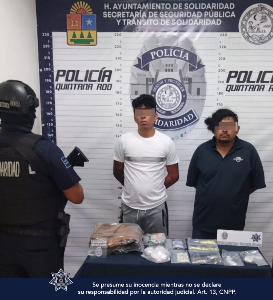 Playa del Carmen, Solidaridad.- Durante un recorrido de seguridad y vigilancia, policías de la Secretaría de Seguridad Pública y Tránsito Municipal de Solidaridad aseguraron a dos sujetos en la colonia Colosio, en posesión de más de 30 envoltorios con posibles drogas como cristal, cocaína, marihuana y piedra.