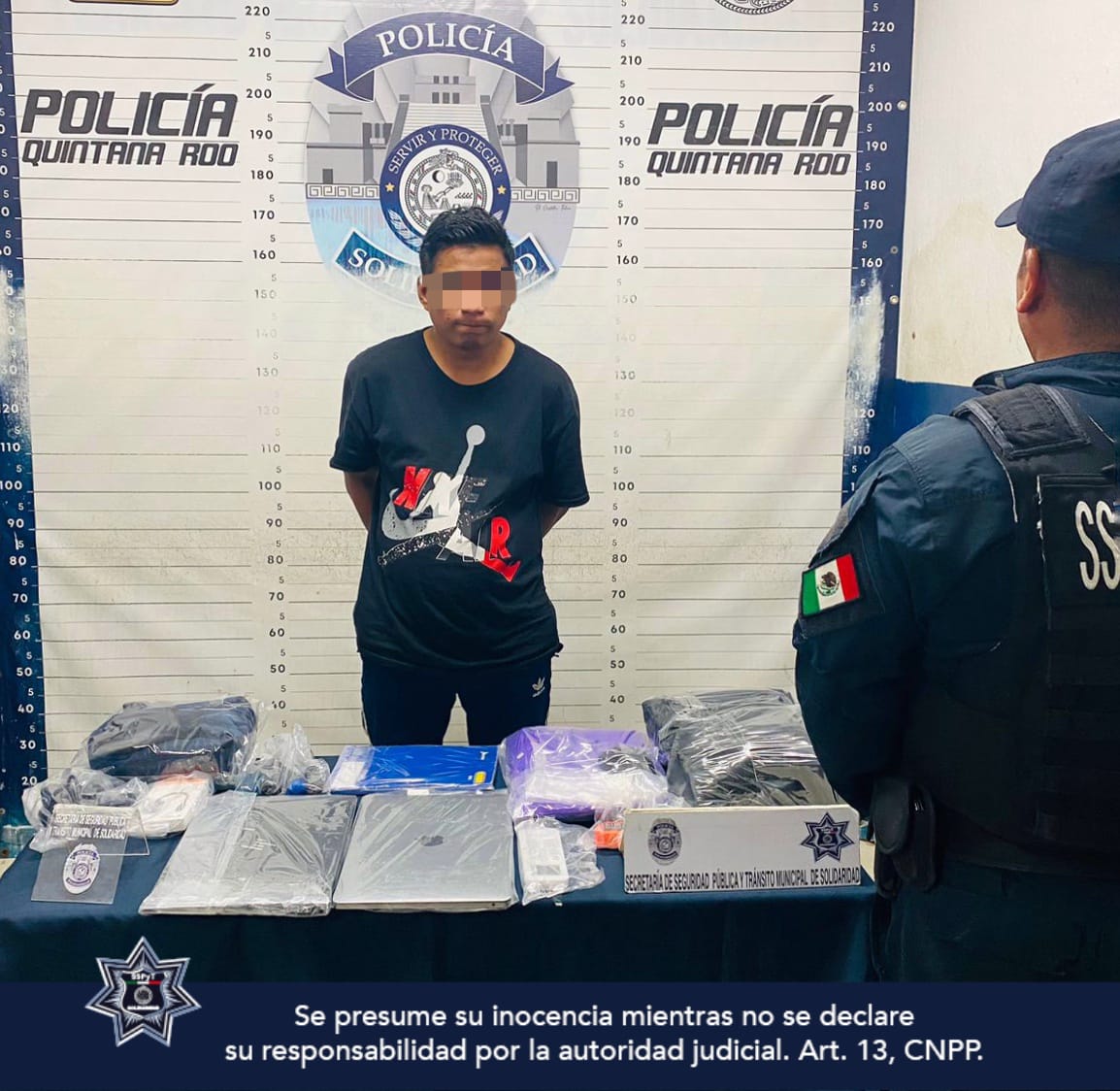 En otro caso, los oficiales recorrían la colonia Colosio, cuando una persona que corría tras un sujeto les solicitó auxilio y lo señaló de revisar los autos en un estacionamiento público. Tras darle alcance a quien se identificó como Abraham “N” de 33 años de edad, de Tabasco, fue asegurado con 2 mochilas, 2 laptop y varios artículos de papelería, cómputo y herramientas.