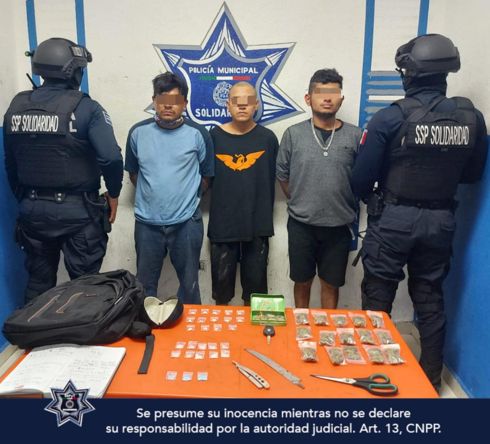 Tres sujetos en posesión de 42 dosis de narcóticos fueron asegurados por policías de la Secretaría de Seguridad Pública y Tránsito Municipal de Solidaridad, tras responder a una denuncia ciudadana por medio del número de emergencias 911.