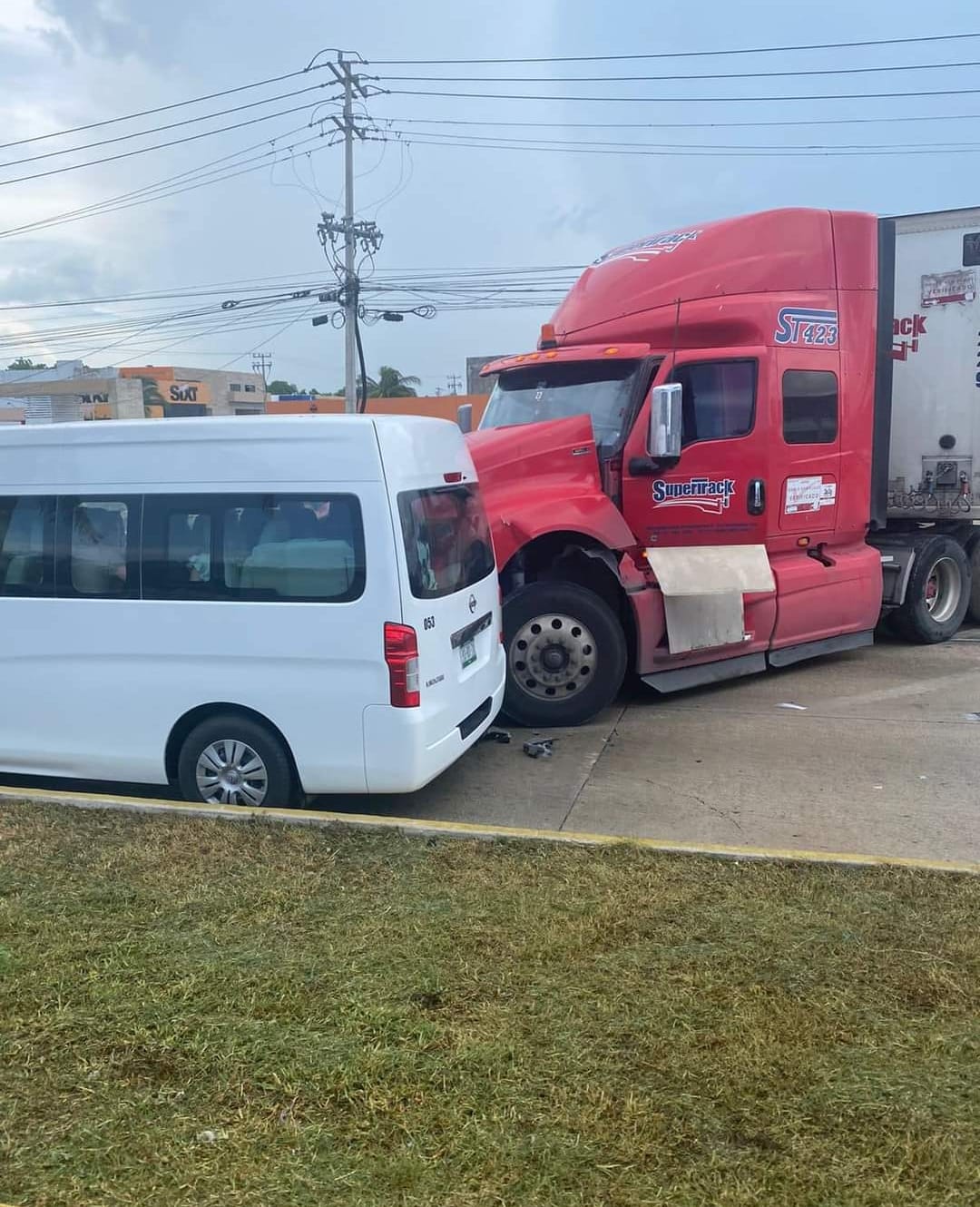Cancún.- Esta tarde, un accidente entre un una van de pasajeros y un tráiler doble remolque paralizó la circulación en el carril hacia el sur, sobre el boulevard Luis Donaldo Colosio. No se reportaron lesionados.