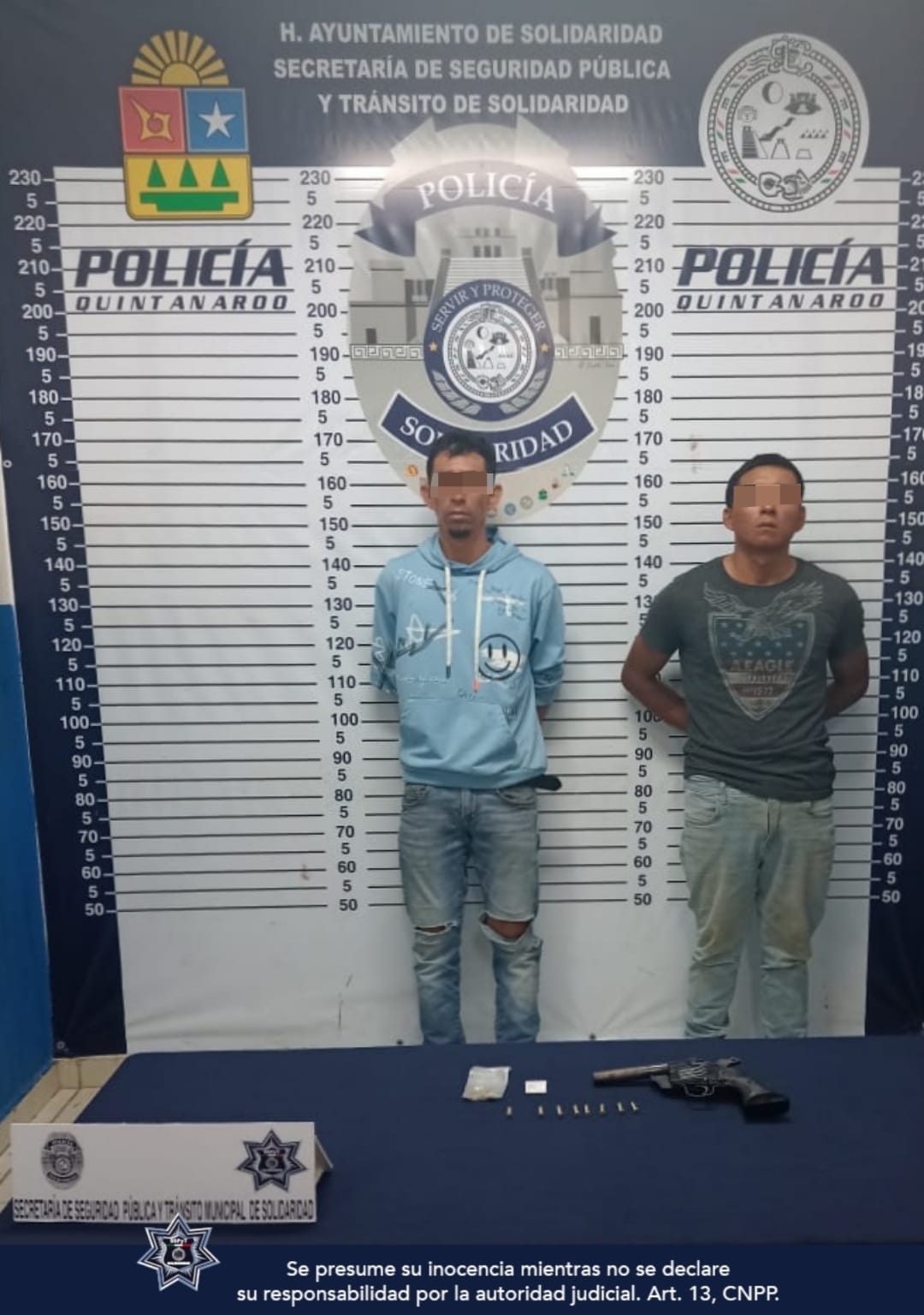 Playa del Carmen.- policías de la Secretaría de Seguridad Pública y Tránsito Municipal de Solidaridad detuvieron a dos masculinos señalados de robar en un domicilio y por posesión de una réplica de arma de fuego tipo revolver, 5 cartuchos, 2 casquillos y posible marihuana y cocaína.