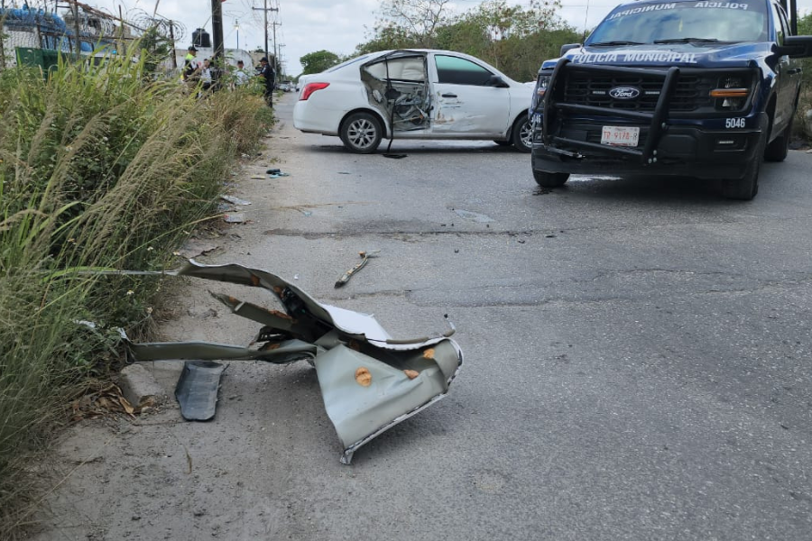 En un giro arriesgado, el vehículo invadió el sentido contrario y terminó impactándose violentamente contra una patrulla municipal frente al cárcamo de aguas negras de Aguakan.
