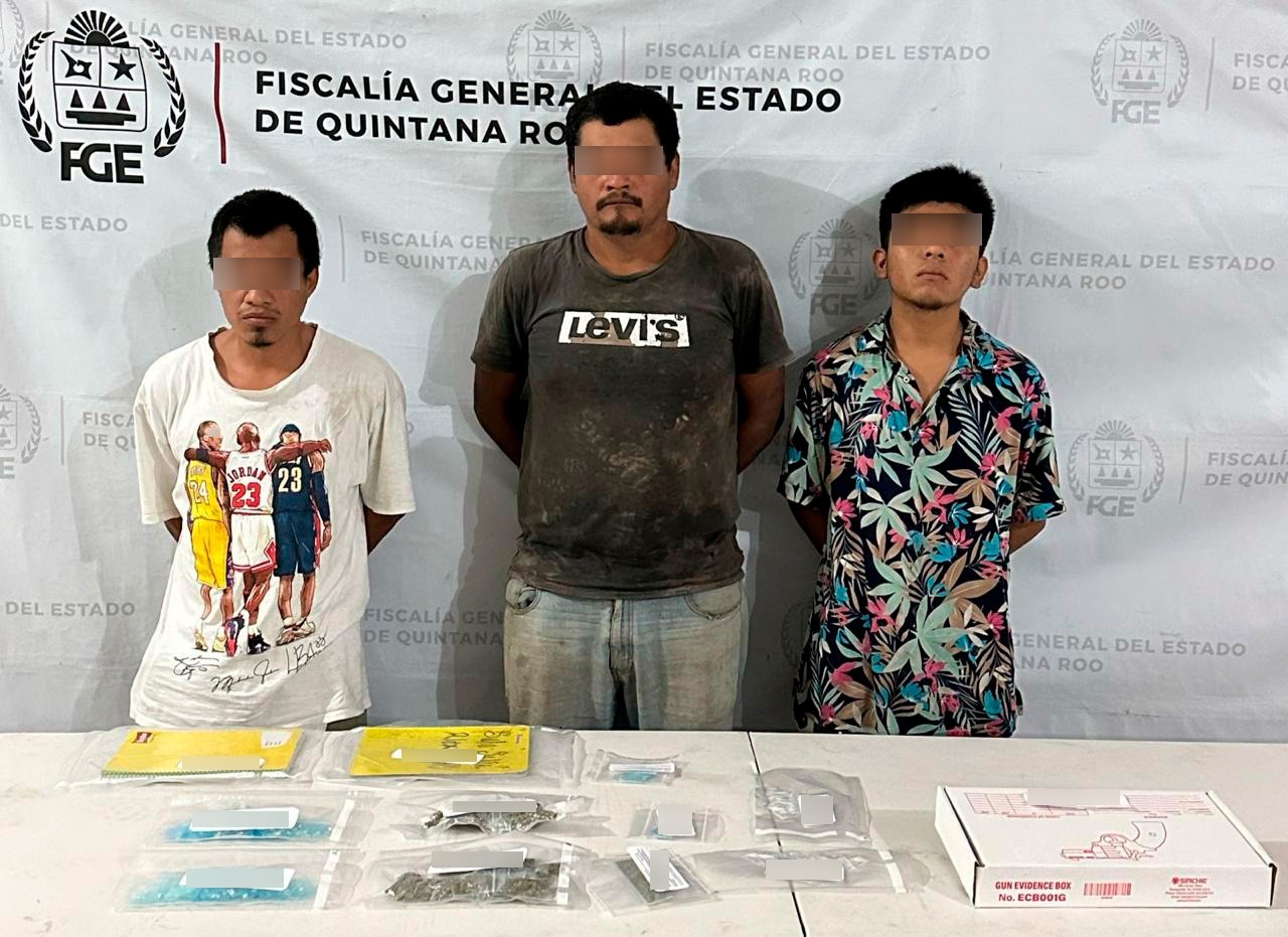 En la primera acción, elementos de la Policía de Investigación, adscritos a la Fiscalía Especializada en Combate al Delito de Narcomenudeo, detuvieron a Raúl Alejandro “N”, Tania Alejandra “N” y Corradino “N” en la avenida Miguel Hidalgo (Ruta 5), a la altura de la Supermanzana 259 del municipio de Benito Juárez.