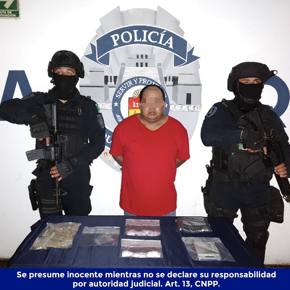 SOLIDARIDAD.- Elementos de la Policía Quintana Roo realizaron la detención de Marco Antonio “N”, por su probable participación en delitos contra la salud.