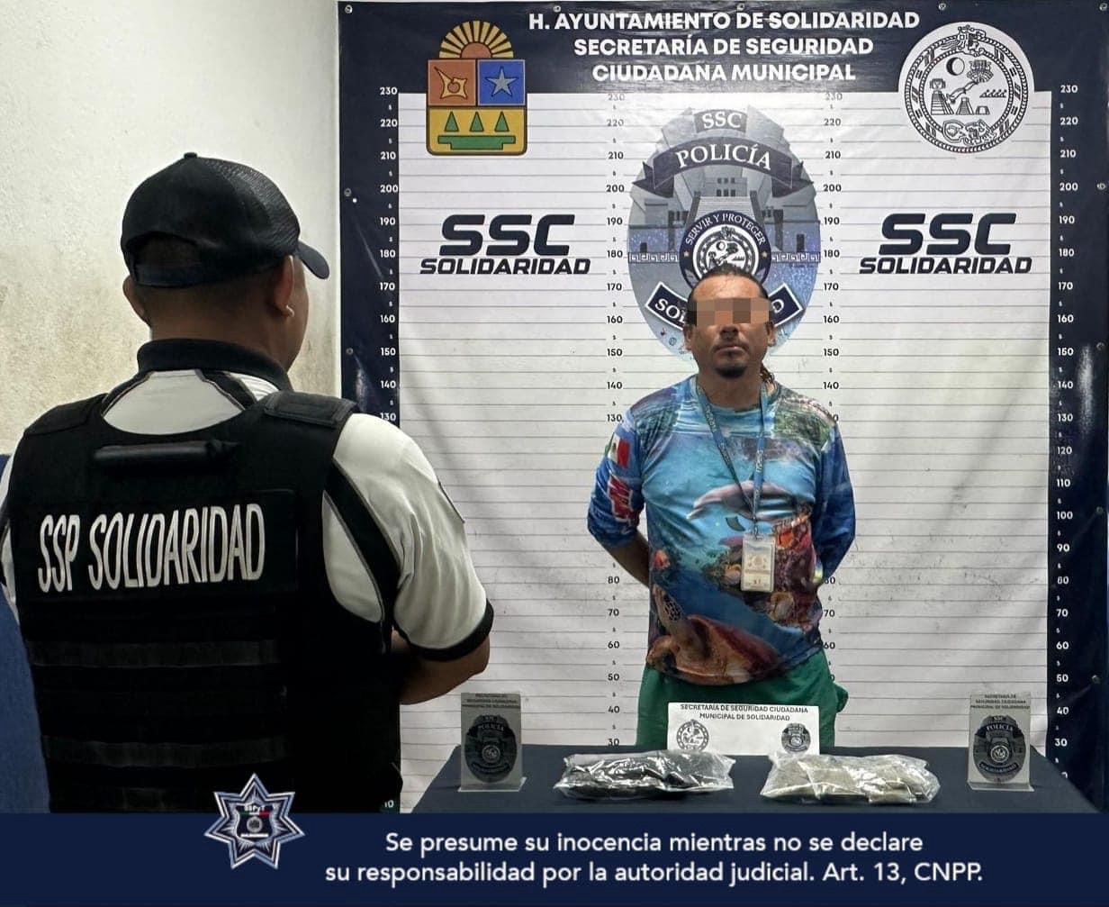 La Policía Municipal aseguró a un hombre en posesión de posibles narcóticos durante un operativo de vigilancia en la colonia Playacar Fase II.