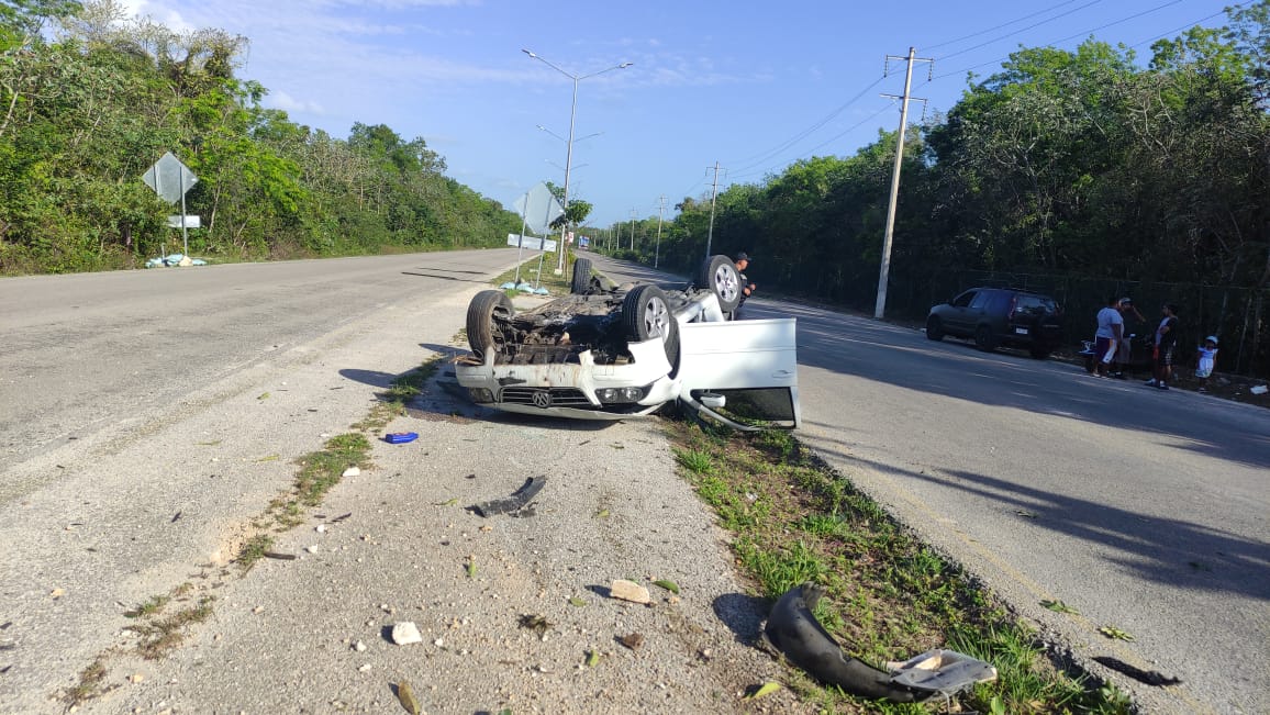 PLAYA DEL CARMEN.- Una volcadura se registró esta mañana sobre la vialidad que va hacia el fraccionamiento Villas del Sol y conecta con el filtro de seguridad de la salida a Mérida, Yucatán.