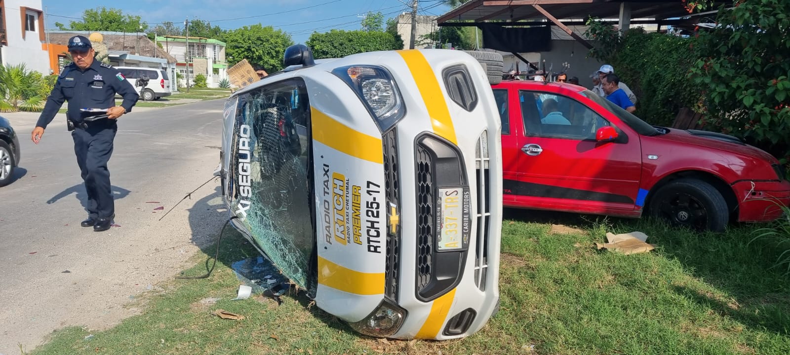 Chetumal.- La mañana de hoy, un vehículo que operaba como taxi terminó semivolcado, al ser colisionado por otra unidad que se no respetó su alto obligatorio, entre las calles Florencia con Laguna de Bacalar de esta ciudad.