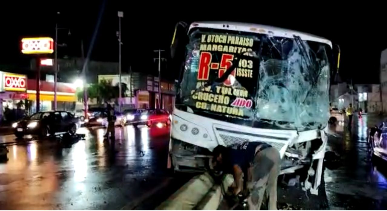 CANCÚN.- El conductor de transporte público de la ruta 5 ocasionó un aparatoso accidente esta noche en la avenida José López Portillo en la Supermanzana 94, al estrellarse contra un semáforo.