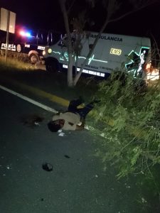 Chetumal.- Una combi de transporte público arrolló y mató a un hombre que viajaba en motocicleta; el vehículo del conductor terminó incendiándose mientras era arrastrada por la combi, en la carretera Chetumal-Bacalar, cerca de las instalaciones del C4, esta noche.