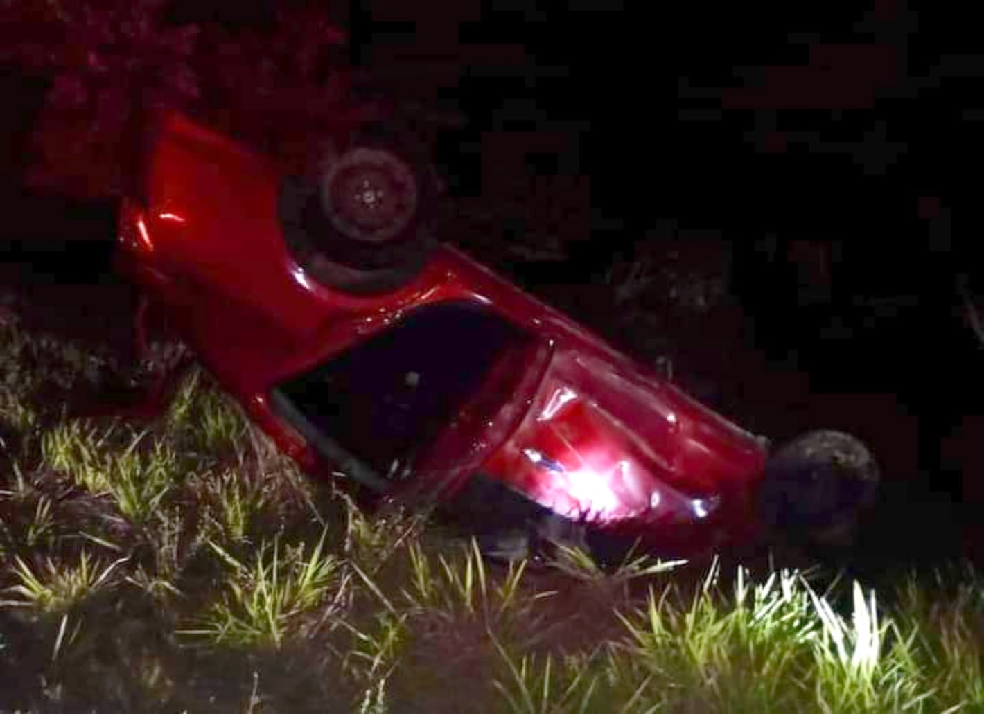 Tras el choque, el auto color rojo volcó, quedando a un lado del camino.