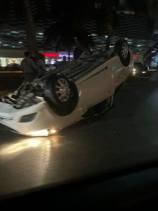 Cancún.-Tremendo susto se llevó el conductor de un vehículo compacto y su acompañante, pues terminaron volcados sobre la avenida Bonampak la noche de este jueves; por fortuna ambos resultaron ilesos, pero su vehículo tuvo daños materiales de consideración.