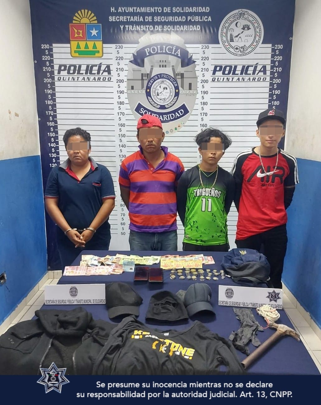 Playa del Carmen.- Derivado de la pronta reacción en respuesta a una solicitud de auxilio, una mujer y tres hombres de los cuales dos son menores de edad, fueron asegurados por policías de la Secretaría de Seguridad Pública y Tránsito Municipal de Solidaridad por la posible comisión del delito de robo a un motel.