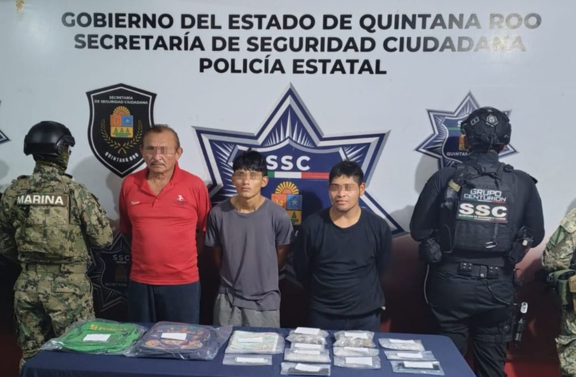 Cancún.- En un despliegue operativo conjunto en la zona norte del municipio de Benito Juárez, personal de la Secretaría de Seguridad Ciudadana, en coordinación con la Guardia Nacional y las Secretarías de Marina y de la Defensa Nacional, detuvo a tres individuos identificados como Luis “N”, Miguel Ángel “N” y Alejandro “N”, por su probable participación en delitos contra la salud relacionados con el narcomenudeo.