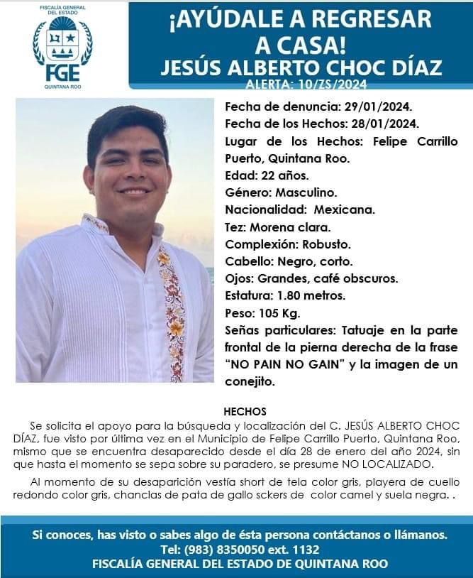 De acuerdo con la Fiscalía General del Estado, Jesús Alberto Choc Díaz de 22 años de edad, fue visto por última vez en el Municipio de Felipe Carrillo Puerto, Quintana Roo el día 28 de enero del año 2024, sin que hasta el momento se sepa sobre su paradero.