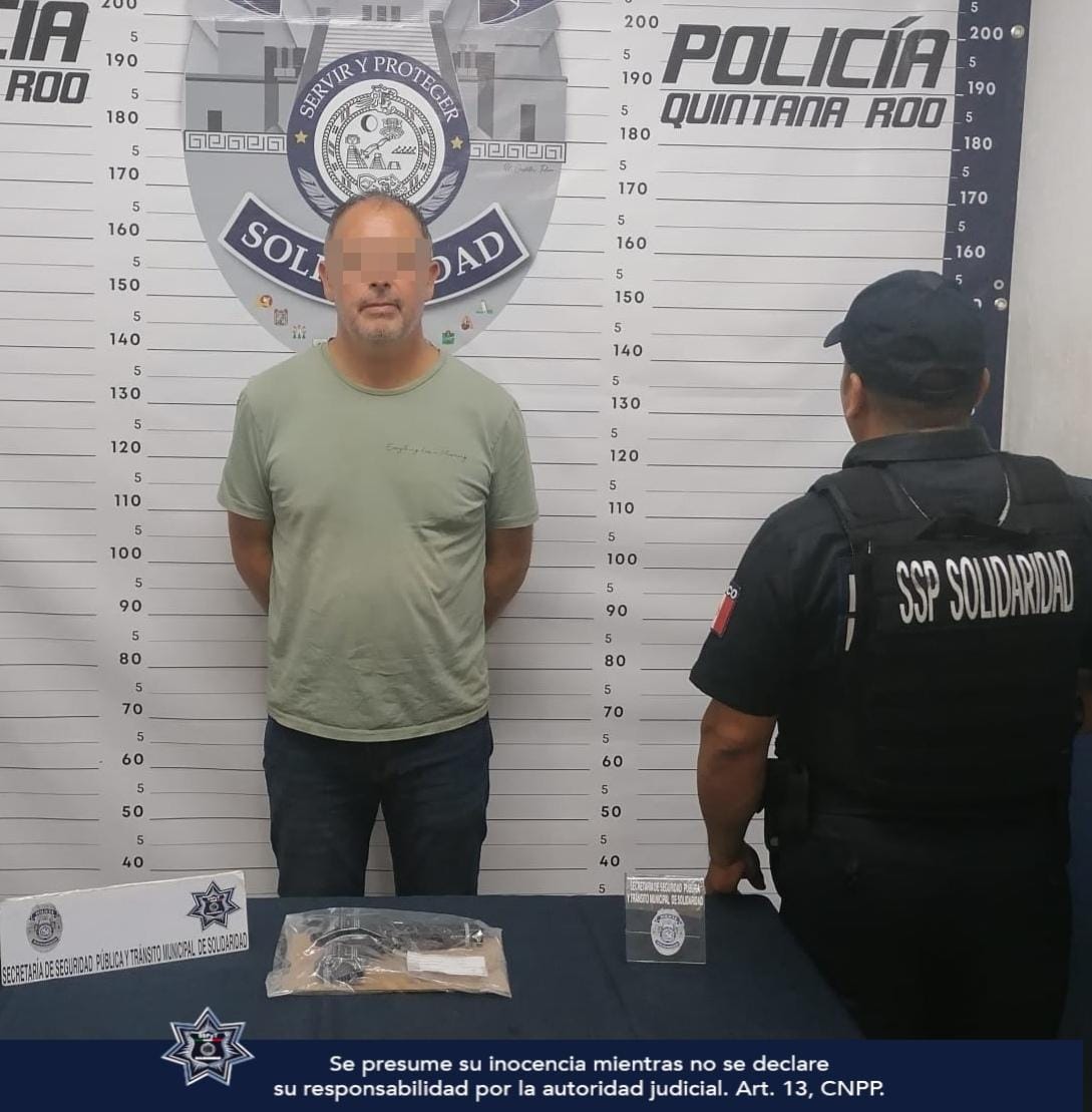 Playa del Carmen.- Policías de la Secretaría de Seguridad Pública y Tránsito Municipal de Solidaridad aseguraron a un sujeto y una réplica de arma de fuego, en el Puesto de Inspección Preventiva ubicado en la carretera federal, Kilómetro 307, Playa del Carmen-Cancún.