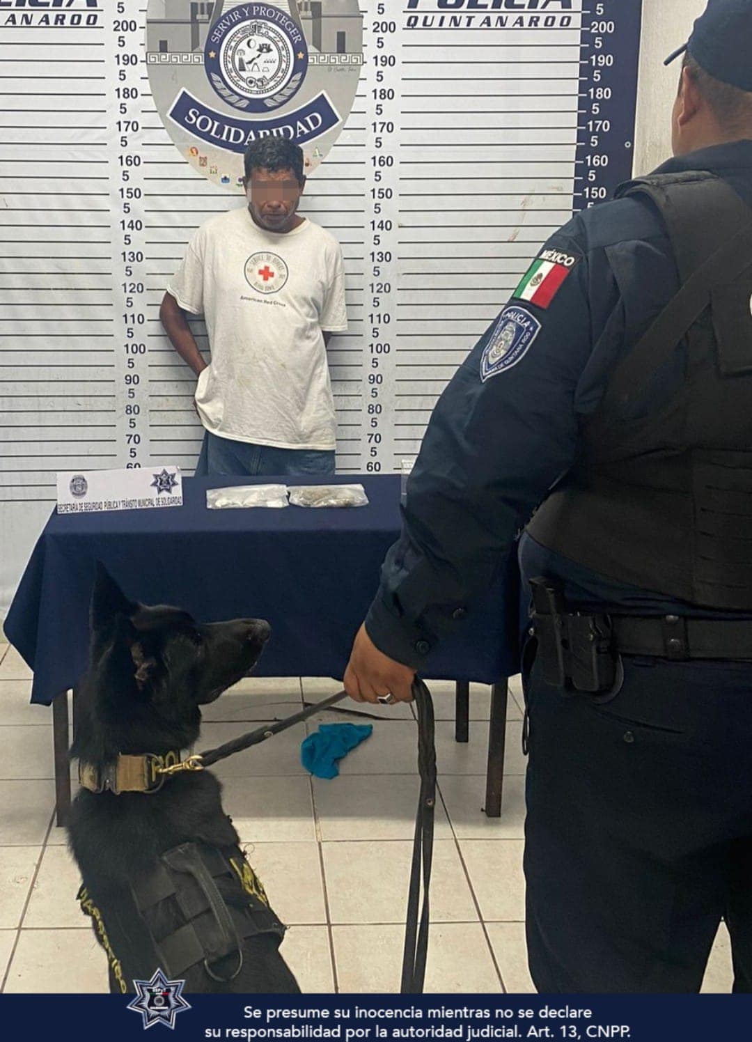 Policías de la Secretaría de Seguridad Pública y Tránsito Municipal de Solidaridad aseguraron a un sujeto en posesión de posible marihuana y cocaína en el Puesto de Inspección Preventiva ubicado en el filtro de la carretera federal, kilómetro 307, Playa del Carmen – Cancún.