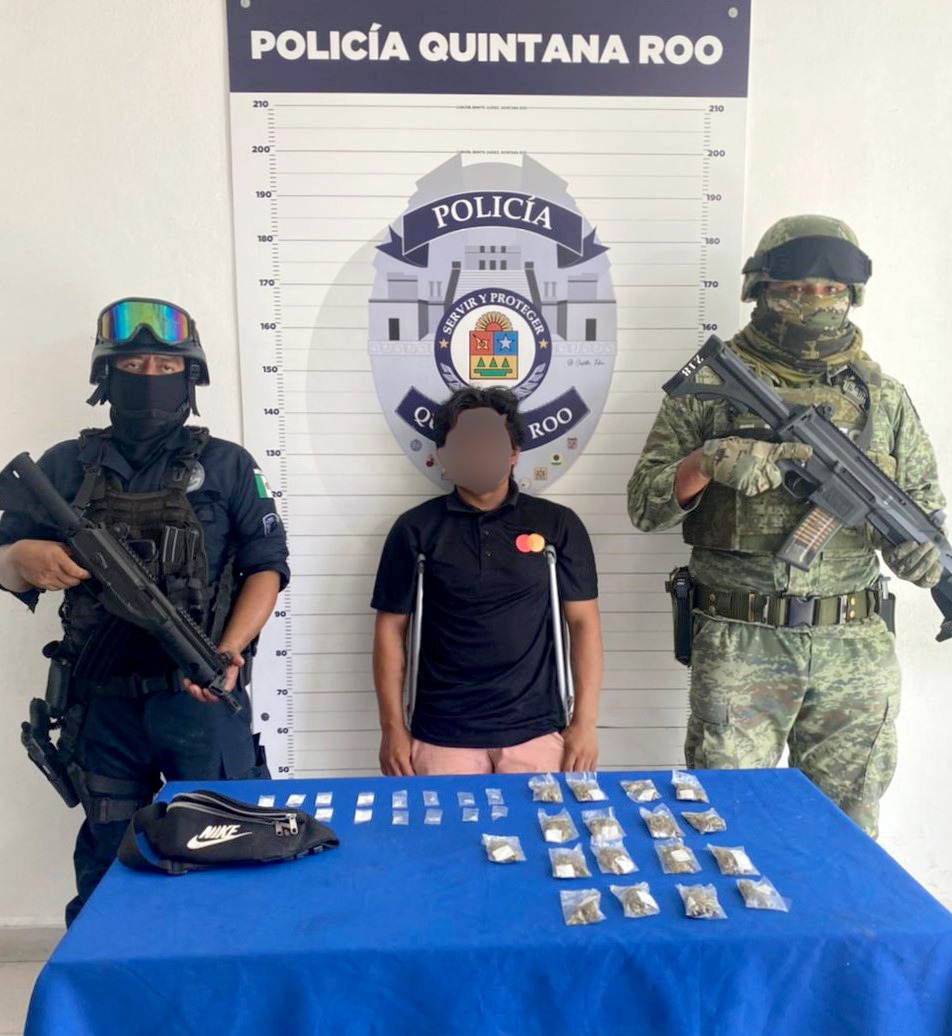 Cancún, Quintana Roo.- Dentro del operativo “Benito Juárez Seguro”, elementos de la Policía Quintana Roo Benito Juárez y de la Secretaría de la Defensa Nacional (SEDENA) lograron la detención de José Antonio N., de 23 años, originario de Cancún, oficio agricultor, por delitos contra la salud.