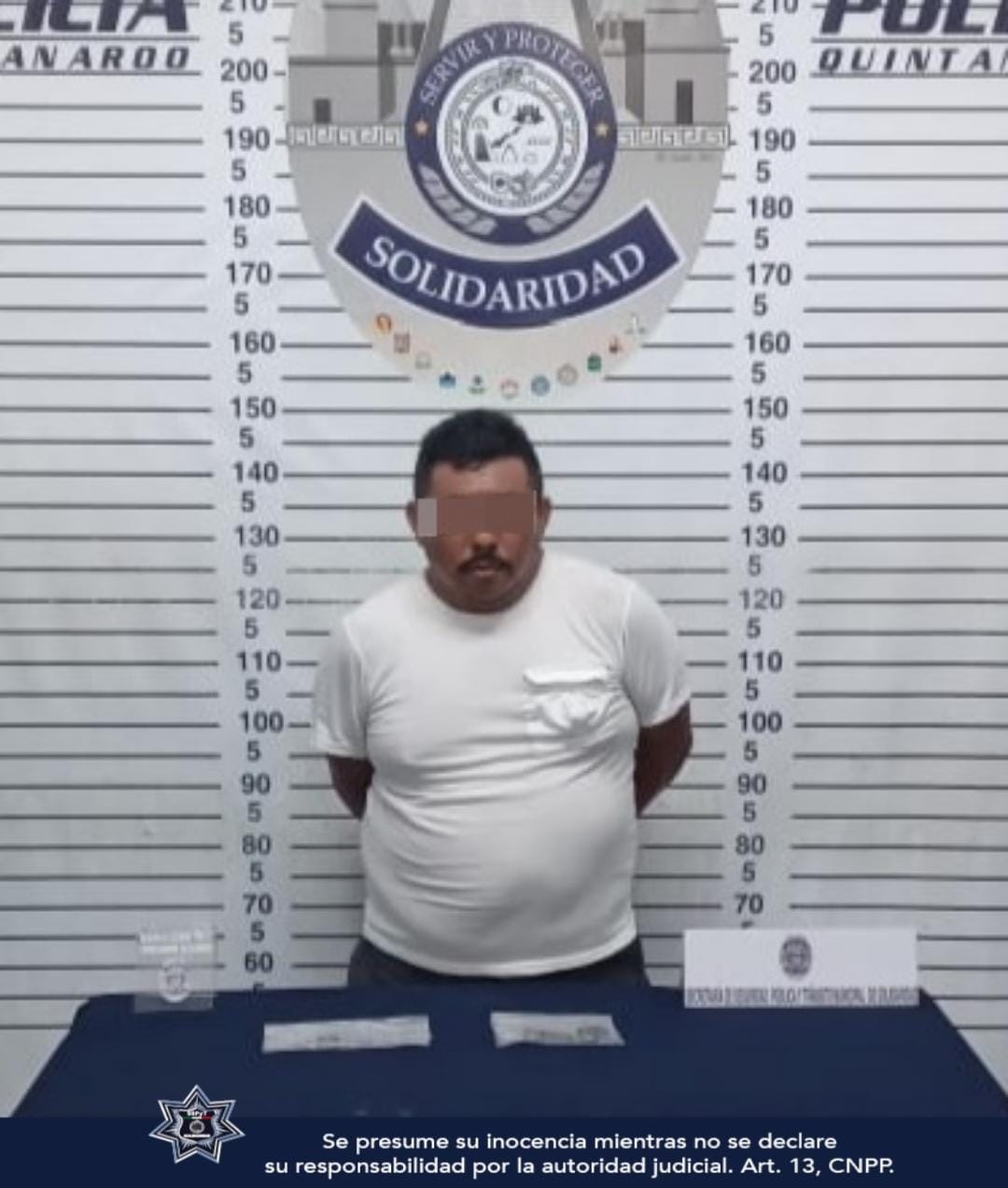 Policías de la Secretaría de Seguridad Pública y Tránsito Municipal de Solidaridad aseguraron a un sujeto en posesión de posibles narcóticos como cristal y cocaína en el fraccionamiento Arrecifes.