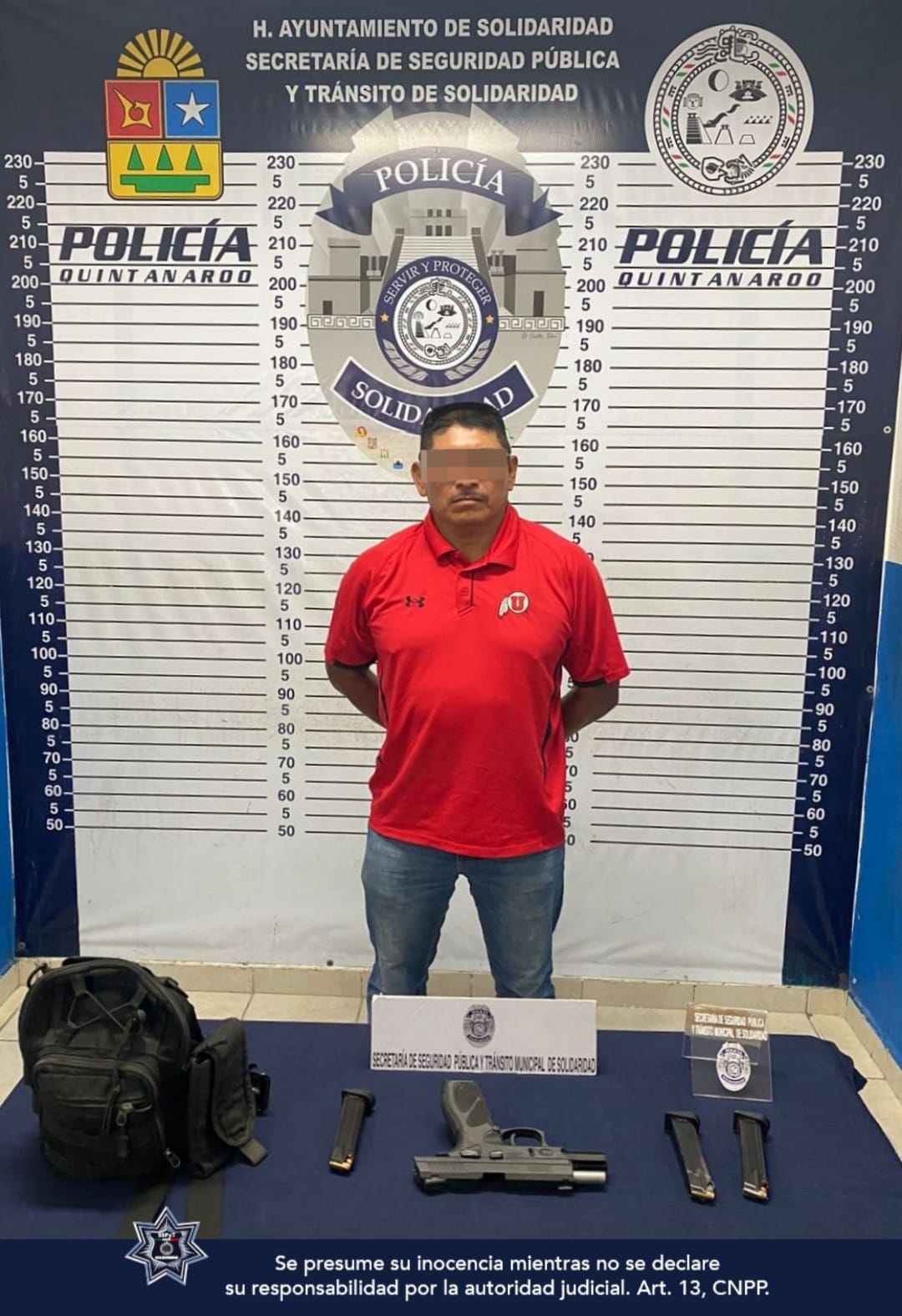 Playa del Carmen, Solidaridad.- Como parte de las acciones de prevención y disuasion de delitos, policías de la Secretaría de Seguridad Pública y Tránsito Municipal de Solidaridad, aseguraron a un sujeto en posesión de un arma de fuego y 54 cartuchos útiles durante un puesto de inspección preventiva en la colonia Ejido.