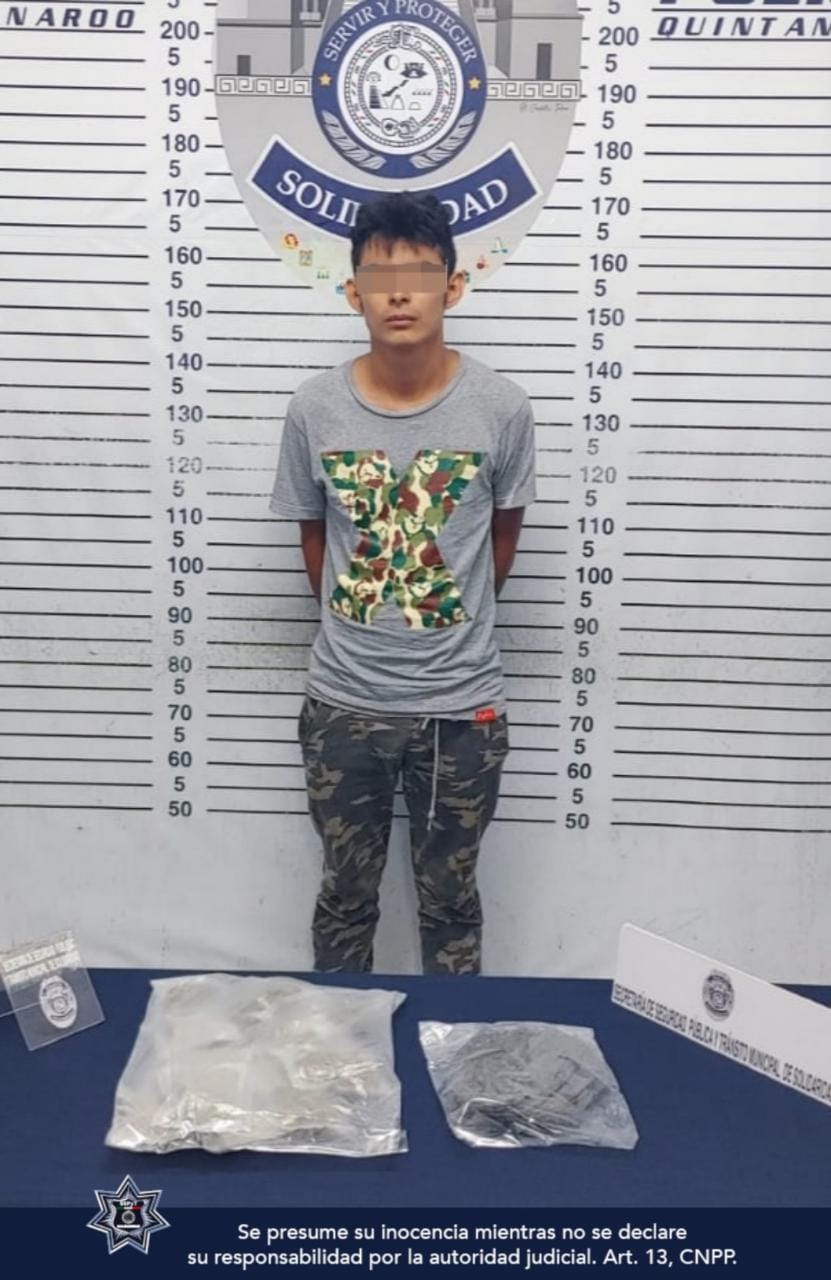 Playa del Carmen, Solidaridad.- Derivado de la implementación de un operativo de vigilancia, policías de la Secretaría de Seguridad Pública y Tránsito Municipal de Solidaridad aseguraron a un sujeto en posesión de posible marihuana en la calle Sin nombre, en el fraccionamiento Villas del Sol.