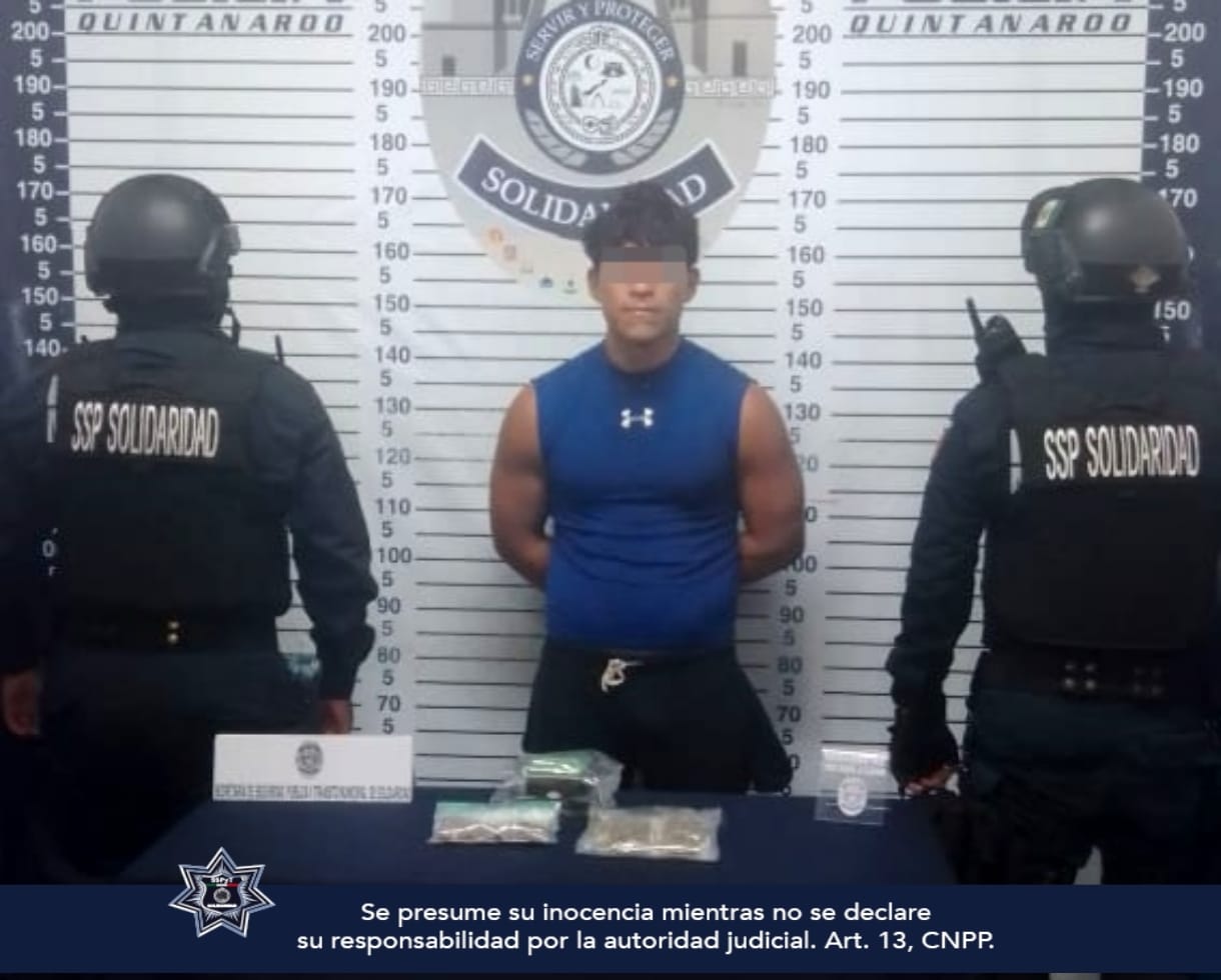 Playa del Carmen, Solidaridad .- Resultado del incremento de patrullaje en la colonia Ejido, policías de la Secretaría de Seguridad Pública y Tránsito Municipal de Solidaridad, realizaron el aseguramiento de una persona en posesión de posible marihuana tras darle alcance cuando pretendía darse a la fuga.
